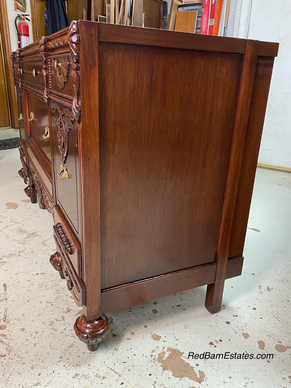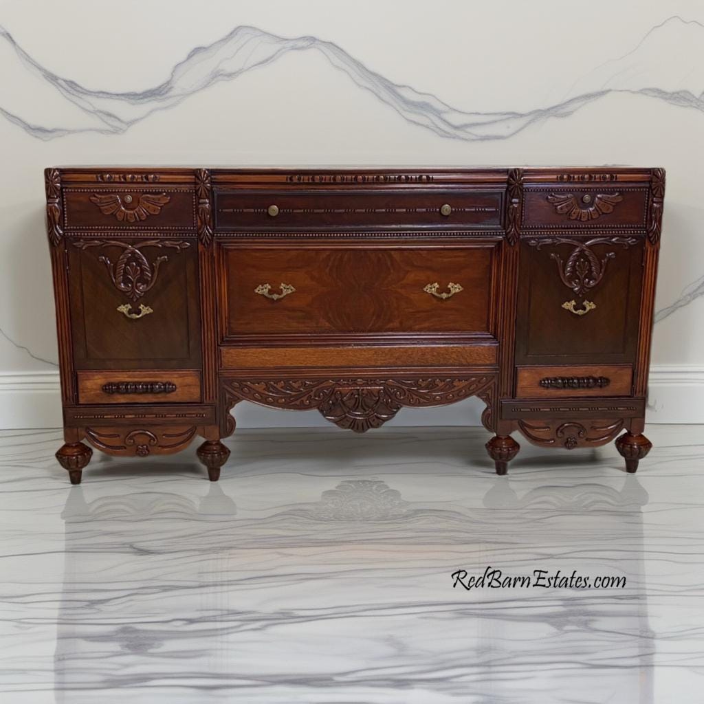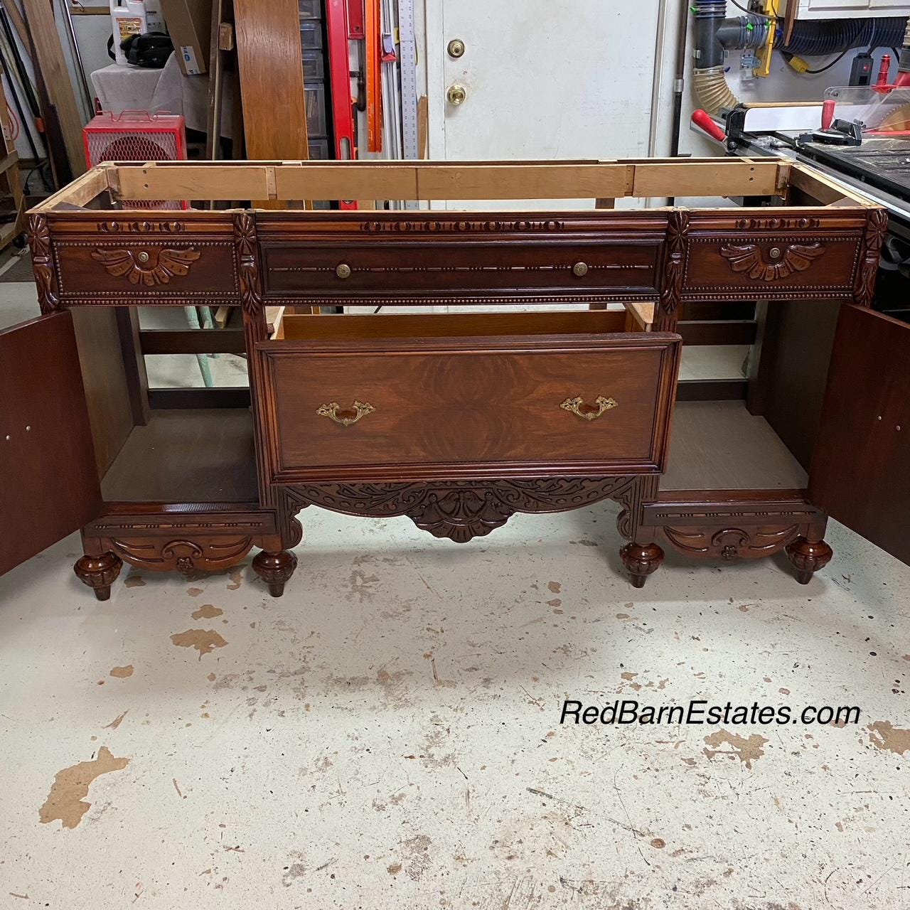 Elevate your master bathroom with this stunning 69-inch antique Victorian bathroom vanity, expertly crafted from a rare early 1900s sideboard. Refurbished for double sinks, or one large center sink, this one-of-a-kind heirloom piece transforms daily routines into luxurious indulgence.